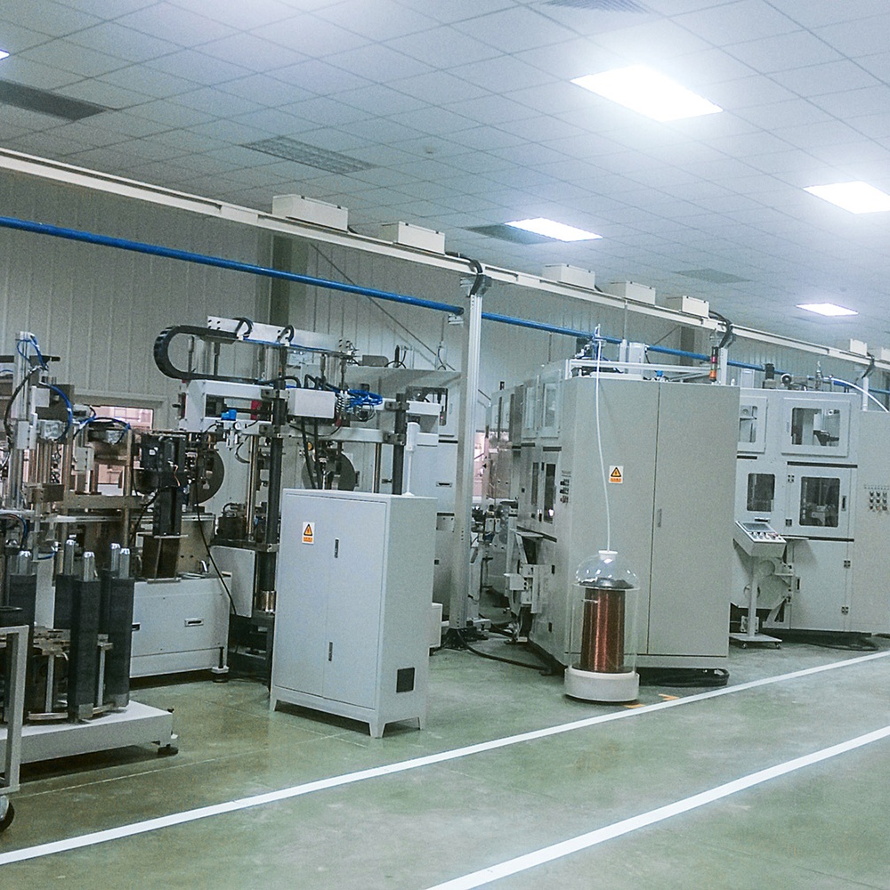 適合空調、冰箱壓縮機、風扇及水泵、洗衣機等感應電機定子的全自動無人化生產線。該線集世界先進的電機定子生產技術于一身,所有元器件采用世界品牌,繞線、下線采用多臺繞下線一體機組成、機器人上下料、整形機采用全伺服驅動、回轉工作臺方式、綁扎機采用四工位布置、帶自動打結功能、整線設備實現(xiàn)無人操作,可以真正做到不停機生產的全自動線,該線可以加工小槽口高槽滿率散片電機定子,13秒的生產節(jié)拍,先進的配置是世界性價。